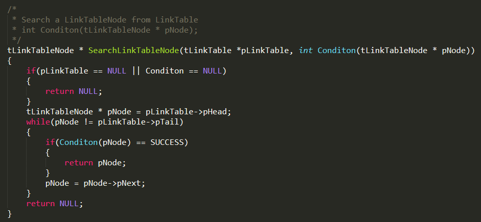 callback接口方式非常像谍战剧里派遣卧底,这里SearchLinkTableNode函数派遣了一个卧底Conditon并指定了卧底负责收集的情报范围tLinkTableNode * pNode,一旦发现目标情报卧底就被激活return pNode。