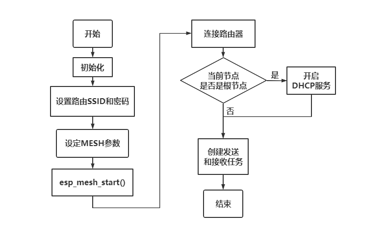 将ESP-MESH自组网这一较为复杂的功能,分为信号检测、节点选择、路由表构建、故障处理等多个相对简单的部分,分别实现其子功能,最后协同构成自组网这一复杂功能。