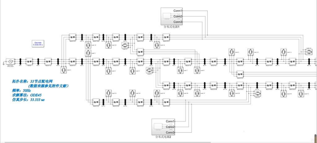 含分布式电源的33节点配电网matlab模型图,支持matlab2021a版及以上版本运行,分布式电源可自行修改输出功率以及调整接入配电网节点的位置,联系可附含分布式电源的33节点配电网潮流计算程序以及节点电压图