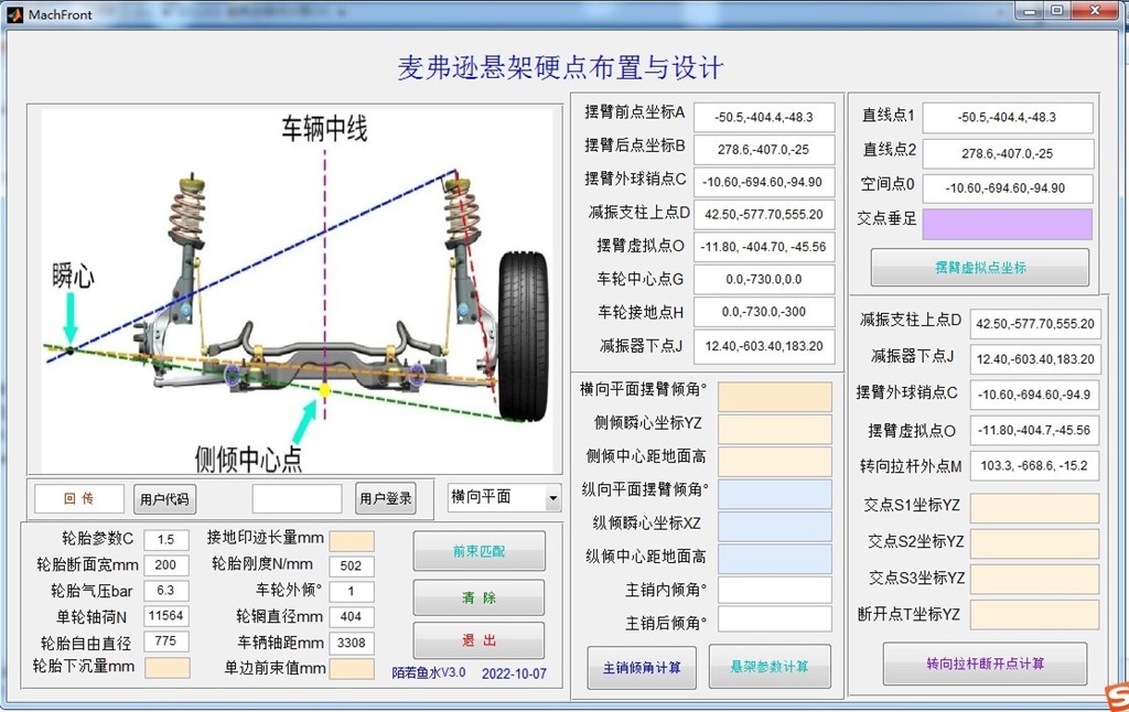 程序名称:麦弗逊悬架硬点布置 开发平台:基于matlab平台 计算内容:根据设计输入,布置麦弗逊悬架硬点坐标,匹配转向拉杆断开点,匹配车轮外倾角和前束值,从而获得硬点初版坐标。 适用对象:学习群体、初入行技术人员 申明提示: (1)计算程序:主要解决匹配布置问题,计算结果的正确性已在文档中进行了验证。 (2)技术文档:包括硬点布置,计算结果验证,外倾和前束匹配原理,减振器侧向力,双球头摆臂均有介绍