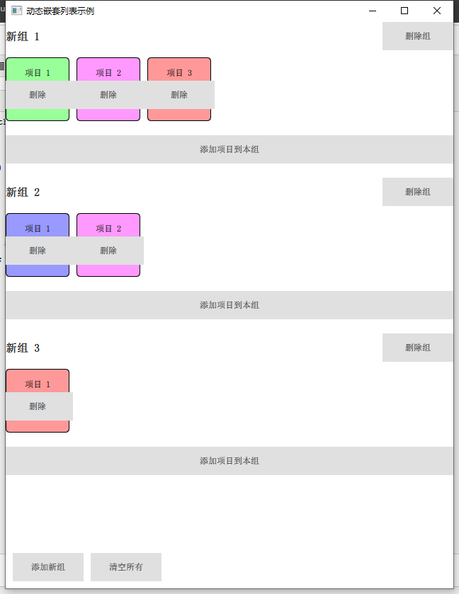 import QtQuick 2.15 import QtQuick.Controls 2.15 import QtQuick.Layouts 1.15 ApplicationWindow { width: 600 height: 800 visible: true title: "动态嵌套列表示例" // 主数据模型 property var mainData: [ { groupName: "默认组", items: [ { name: "项目1", color: "lightblue" }, { name: "项目2", color: "lightgreen" } ] } ] // 颜色选项 property var colorOptions: ["#FF9999", "#99FF99", "#9999FF", "#FFFF99", "#FF99FF", "#99FFFF"] // 主ListView ListView { id: listView anchors.fill: parent spacing: 20 model: mainData delegate: listDelegate } // ListView的委托组件 Component { id: listDelegate Column { id: listColumn width: listView.width spacing: 10 property int groupIndex: index // 保存当前组的索引 // 组标题行 RowLayout { width: parent.width spacing: 10 Text { text: modelData.groupName font.bold: true font.pixelSize: 16 Layout.fillWidth: true } Button { text: "删除组" onClicked: removeGroup(groupIndex) } } // 内嵌的GridView GridView { id: gridView width: parent.width height: Math.ceil(modelData.items.length / 3) * 100 cellWidth: 100 cellHeight: 100 model: modelData.items delegate: gridDelegate Label { visible: parent.count === 0 anchors.centerIn: parent text: "点击下方按钮添加项目" } } // 添加项目按钮 Button { width: parent.width text: "添加项目到本组" onClicked: addItemToGroup(groupIndex) } } } // GridView的委托组件 Component { id: gridDelegate Rectangle { width: 90 height: 90 color: modelData.color border.color: "black" radius: 5 Column { anchors.centerIn: parent spacing: 5 Text { text: modelData.name font.pixelSize: 12 anchors.horizontalCenter: parent.horizontalCenter } Button { text: "删除" anchors.horizontalCenter: parent.horizontalCenter onClicked: { // 通过parent层级访问外部委托的groupIndex var outerDelegate = parent.parent.parent.parent.parent removeItemFromGroup(outerDelegate.groupIndex, index) } } } } } // 底部控制面板 footer: Row { spacing: 10 padding: 10 Button { text: "添加新组" onClicked: addNewGroup() } Button { text: "清空所有" onClicked: clearAll() } } // === 功能函数 === function addNewGroup() { var groupCount = mainData.length + 1; mainData.push({ groupName: "新组 " + groupCount, items: [] }); mainData = mainData.slice(); } function removeGroup(groupIndex) { mainData.splice(groupIndex, 1); mainData = mainData.slice(); } function addItemToGroup(groupIndex) { var itemCount = mainData[groupIndex].items.length + 1; mainData[groupIndex].items.push({ name: "项目 " + itemCount, color: colorOptions[Math.floor(Math.random() * colorOptions.length)] }); mainData = mainData.slice(); } function removeItemFromGroup(groupIndex, itemIndex) { mainData[groupIndex].items.splice(itemIndex, 1); mainData = mainData.slice(); } function clearAll() { mainData = []; mainData = mainData.slice(); } // // 修改指定ID项的颜色 // function changeItemColor(itemId, newColor) { // if (itemReferences[itemId]) { // itemReferences[itemId].color = newColor // } // } }