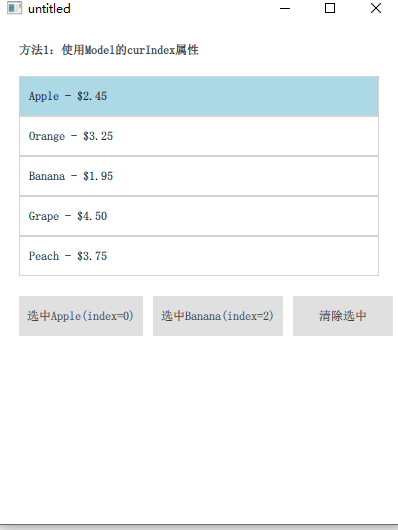 import QtQuick 2.15 import QtQuick.Controls 2.15 ApplicationWindow { width: 400 height: 500 visible: true // 方法1:使用Model的curIndex属性 ListModel { id: fruitModel1 property int curIndex: -1 // 当前选中索引 ListElement { name: "Apple"; cost: 2.45 } ListElement { name: "Orange"; cost: 3.25 } ListElement { name: "Banana"; cost: 1.95 } ListElement { name: "Grape"; cost: 4.50 } ListElement { name: "Peach"; cost: 3.75 } } Column { spacing: 20 anchors.fill: parent anchors.margins: 20 Label { text: "方法1:使用Model的curIndex属性" font.bold: true } ListView { id: listView1 width: parent.width height: 200 model: fruitModel1 currentIndex: fruitModel1.curIndex // 绑定到Model的curIndex clip: true delegate: Rectangle { width: listView1.width height: 40 color: ListView.isCurrentItem ? "lightblue" : "white" border.color: "lightgray" Text { text: name + " - $" + cost.toFixed(2) anchors.verticalCenter: parent.verticalCenter x: 10 } MouseArea { anchors.fill: parent onClicked: { fruitModel1.curIndex = index // 点击时更新Model的curIndex } } } } Row { spacing: 10 Button { text: "选中Apple(index=0)" onClicked: fruitModel1.curIndex = 0 } Button { text: "选中Banana(index=2)" onClicked: fruitModel1.curIndex = 2 } Button { text: "清除选中" onClicked: fruitModel1.curIndex = -1 } } } }