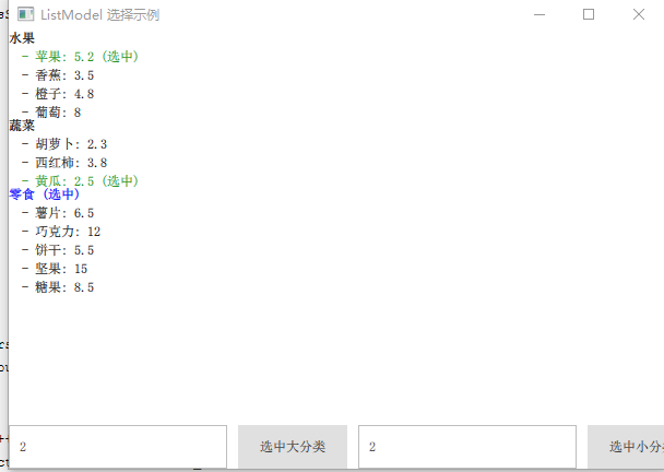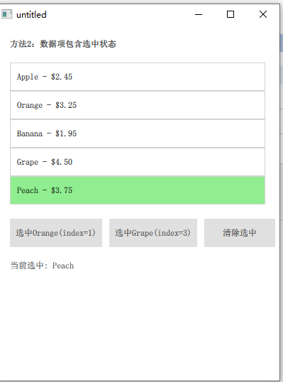 mport QtQuick 2.15 import QtQuick.Controls 2.15 ApplicationWindow { width: 400 height: 500 visible: true // 方法2:在数据项中包含选中状态 ListModel { id: fruitModel2 Component.onCompleted: { append({name: "Apple", cost: 2.45, isSelected: false}) append({name: "Orange", cost: 3.25, isSelected: false}) append({name: "Banana", cost: 1.95, isSelected: false}) append({name: "Grape", cost: 4.50, isSelected: false}) append({name: "Peach", cost: 3.75, isSelected: false}) } function setSelectedIndex(index) { for (var i = 0; i < count; i++) { setProperty(i, "isSelected", i === index) } } function getSelectedIndex() { for (var i = 0; i < count; i++) { if (get(i).isSelected) return i } return -1 } } Column { spacing: 20 anchors.fill: parent anchors.margins: 20 Label { text: "方法2:数据项包含选中状态" font.bold: true } ListView { id: listView2 width: parent.width height: 200 model: fruitModel2 currentIndex: fruitModel2.getSelectedIndex() // 从Model获取选中索引 clip: true delegate: Rectangle { width: listView2.width height: 40 color: isSelected ? "lightgreen" : "white" border.color: "lightgray" Text { text: name + " - $" + cost.toFixed(2) anchors.verticalCenter: parent.verticalCenter x: 10 } MouseArea { anchors.fill: parent onClicked: { fruitModel2.setSelectedIndex(index) } } } } Row { spacing: 10 Button { text: "选中Orange(index=1)" onClicked: fruitModel2.setSelectedIndex(1) } Button { text: "选中Grape(index=3)" onClicked: fruitModel2.setSelectedIndex(3) } Button { text: "清除选中" onClicked: fruitModel2.setSelectedIndex(-1) } } Label { text: "当前选中: " + (fruitModel2.getSelectedIndex() >= 0 ? fruitModel2.get(fruitModel2.getSelectedIndex()).name : "无") } } }