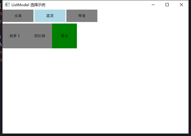 import QtQuick 2.15 import QtQuick.Controls 2.15 import QtQuick.Layouts 1.15 ApplicationWindow { width: 600 height: 400 visible: true title: "ListModel 选择示例" ListModel { id: id_categoryModel Component.onCompleted: { append({ categoryName: "水果", items: [ {name: "苹果", price: 5.2, isSelected: true}, {name: "香蕉", price: 3.5, isSelected: false}, {name: "橙子", price: 4.8, isSelected: false}, {name: "葡萄", price: 8.0, isSelected: false} ], isSelected: true }); append({ categoryName: "蔬菜", items: [ {name: "胡萝卜", price: 2.3, isSelected: false}, {name: "西红柿", price: 3.8, isSelected: false}, {name: "黄瓜", price: 2.5, isSelected: false} ], isSelected: false }); append({ categoryName: "零食", items: [ {name: "薯片", price: 6.5, isSelected: false}, {name: "巧克力", price: 12.0, isSelected: false}, {name: "饼干", price: 5.5, isSelected: false}, {name: "坚果", price: 15.0, isSelected: false}, {name: "糖果", price: 8.5, isSelected: false} ], isSelected: false }); } } function notifyCppCurSheet(name) { console.log("c++ record sheet name", name) } function notifyCppCurDiagram(name) { console.log("c++ record diagram name", name) } ListView { id: id_listview width: parent.width height: 40 model: id_categoryModel orientation: ListView.Horizontal spacing: 3 delegate: Rectangle { width: 100 height: ListView.view.height color: model.isSelected?"lightblue":"gray" Text { anchors.centerIn: parent text: categoryName } MouseArea { anchors.fill: parent onClicked: { for(var i=0; i<id_categoryModel.count; ++i) { id_categoryModel.setProperty(i, "isSelected", false) } model.isSelected = true notifyCppCurSheet(categoryName) } } } } Item { width: parent.width height: parent.height-id_listview.height anchors.top: id_listview.bottom anchors.topMargin: 5 Repeater { model: id_categoryModel Loader { anchors.fill: parent visible: isSelected sourceComponent: GridView { cellWidth: 80 cellHeight: 80 anchors.fill: parent model: items delegate: Rectangle { width: 80 height: 80 Text { anchors.centerIn: parent text: name } color: isSelected?"green":"gray" MouseArea { anchors.fill: parent onClicked: { for(var i=0; i<items.count; ++i) { items.setProperty(i, "isSelected", false) } model.isSelected = true notifyCppCurDiagram(name) } } } } } } } }