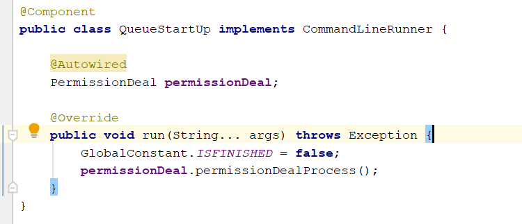 //这个类是为了自动装配 <dependency> <groupId>org.springframework.boot</groupId> <artifactId>spring-boot-autoconfigure</artifactId> <version>2.1.0.RELEASE</version> </dependency> //下面链接是官网对于这个以来的解释 //https://docs.spring.io/spring-boot/docs/2.1.0.RELEASE/reference/html/configuration-metadata.html#configuration-metadata-annotation-processor //这个依赖是为了读取配置文件 <dependency> <groupId>org.springframework.boot</groupId> <artifactId>spring-boot-configuration-processor</artifactId> <version>2.1.0.RELEASE</version> <optional>true</optional> </dependency>自定义一个类,让他实现CommandLineRunner,并在类上加上@Compoent注解,使项目在启动的过程中会自启动。重写run方法,在run方法中执行具体的处理过程。