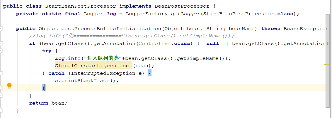 springboot项目在启动时会加载类,这个时候我们自定义一个类,让他去实现BeanPostProcessor,重写postProcessBeforeInitialzation()方法,我们可以按照我们的需要获取我们需要的类对象。具体如下: