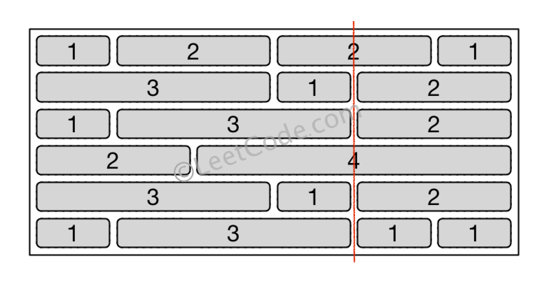 砖墙由行的列表表示。 每一行都是一个代表从左至右每块砖的宽度的整数列表。