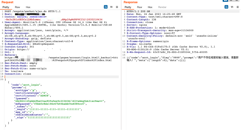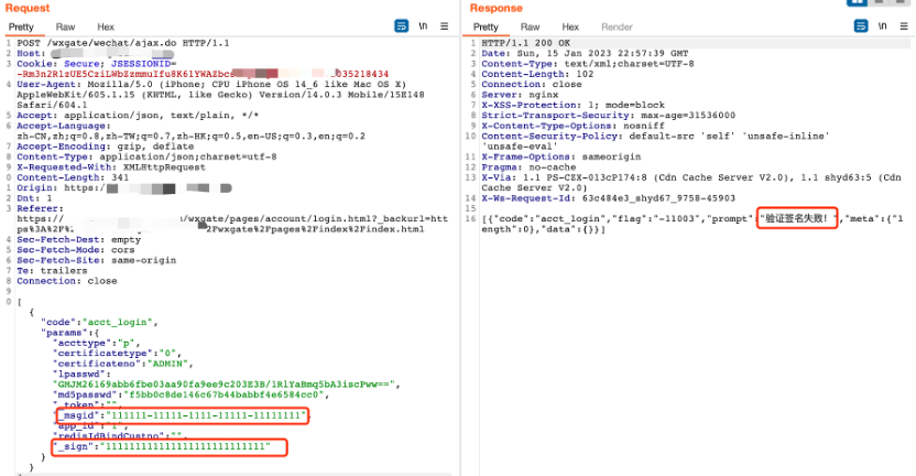 通过测试得知,服务端会对每个请求数据包的”_msgid”和”_sign”参数进行验签,一但数据包被修改或者重复发送相同数据包,服务端则会返回”验证签名失败!”