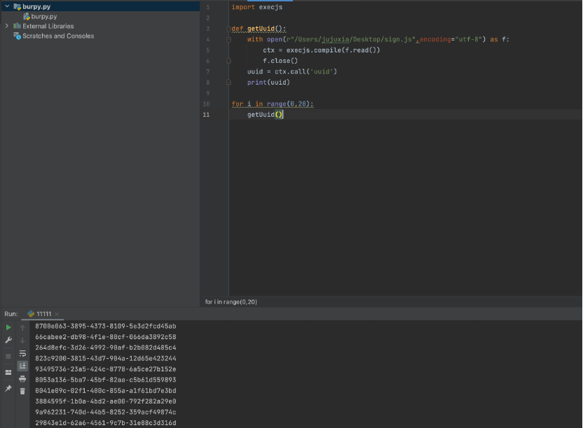 使用python的execjs模块调用sign.js的uuid函数,编写demo测试没问题,加签字段”_msgid”搞定