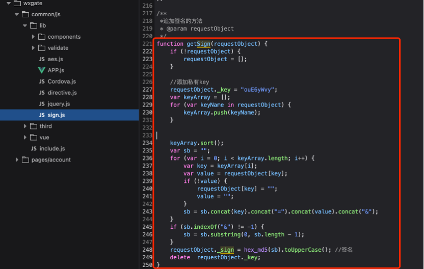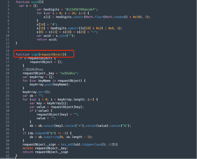 大致的加签数据生成流程已经理清楚,接下来就需要编写burpy脚本搞定”_sign”加签参数,首先把getSign()函数的加密算法抠出来复制到sign.js文件中