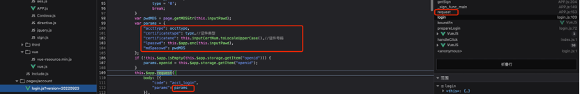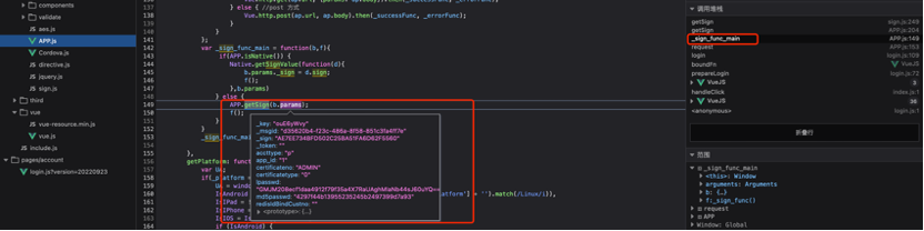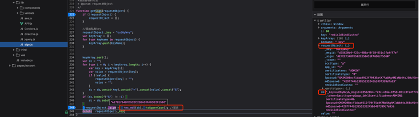 此处对前端代码进行调试,得知传入的参数requestObject为字典格式,通过对字典数据进行处理后得到参数”sb”的值,最终将”sb”的值MD5加密后得到加签字段”_sign”的值