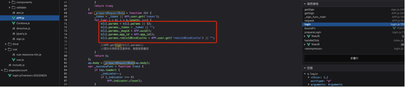 分析后得知”requestObject”由两部分组成,一部分为不固定参数,根据业务功能点不同传入不同的参数字典,另一部分为固定参数token、msgid、app_id、redisIdBindCustno添加到字典数据的尾部,然后传入getSign获取加签参数”_sign”的值