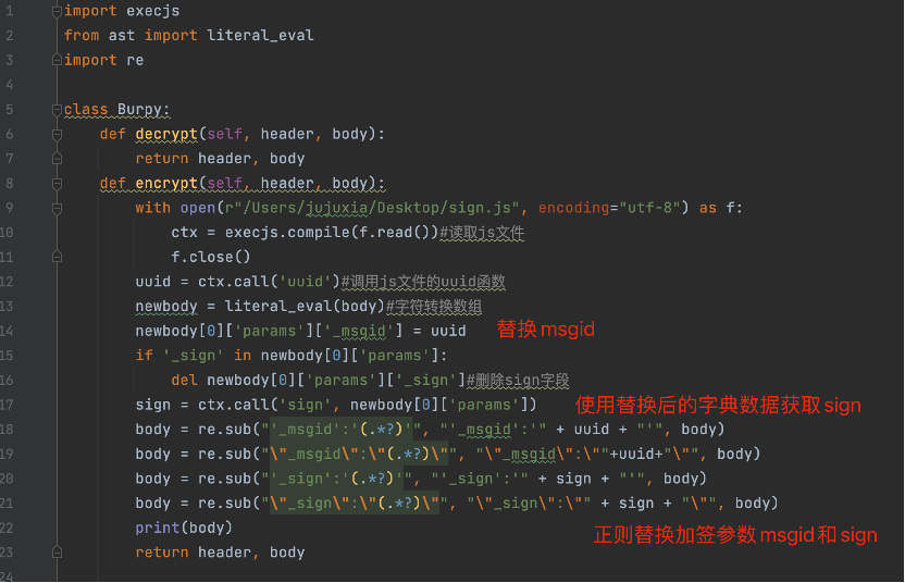 编写脚本调用sign函数获取加签参数”_msgid、_sign”的值,从而实现自动化对数据包进行加签。(注意:传入的encrypt函数的body为str类型,返回时也必须为str类型)