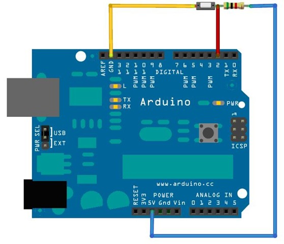 按键占用引脚2,连接效果如图所示(为保持按键没有按下时引脚上保持高电平,所以在引脚上加了一个上拉电阻)