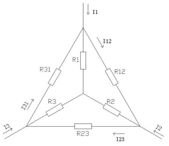 三角形电阻=(星形中个电阻两两乘积之和)/(星形中不相连的一个电阻)