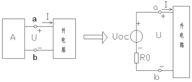 - 对于外电路,一个含独立源的二端网可用一个电压源和电阻串联组合等效,电压源电压等于该二端网的开路电压 Uoc ,电阻等于该二端网所有独立源为零时的输入电阻 R0 (内阻)。