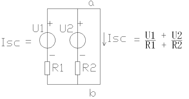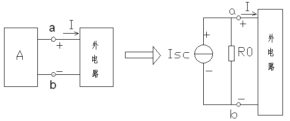 - 对于外电路,一个含独立源的二端网可用一个电流源和电阻并联组合等效,电流源电流等于该二端网的短路电流 Isc ,电阻等于该二端网所用独立源为零时端口处所等效的电阻 R0(内阻)。