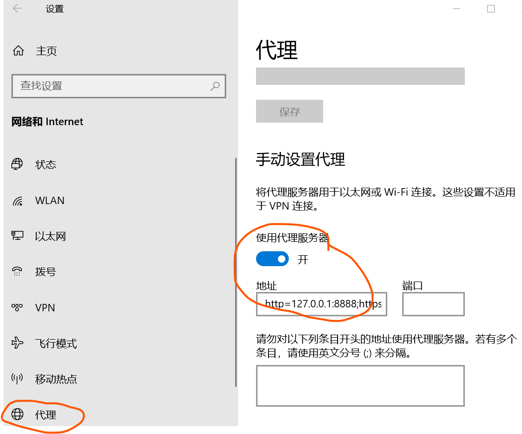 - 设置-> 网络和Internet-> 代理 -> 手动设置代理 开关打开