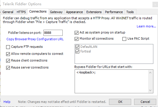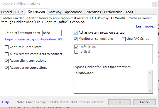 - 安装完后启动,会自动将fiddler设置为系统的代理,查看网络设置是否设置成功