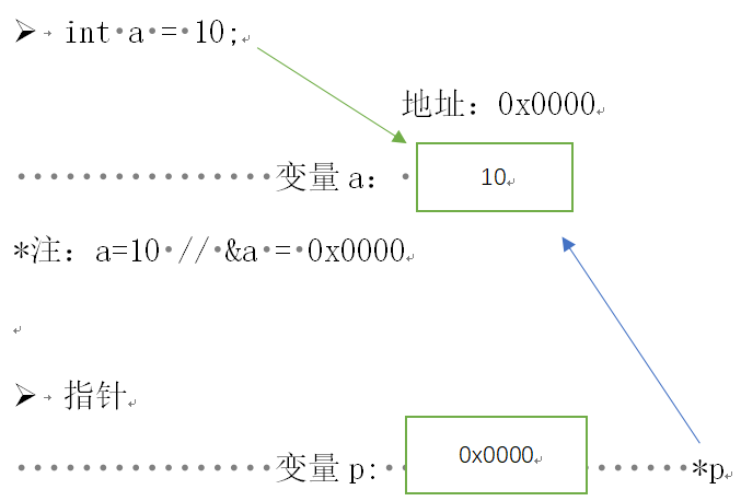 - 指针通过号解引用的方式间接读取p指向的内容,即p=10。并可以对该块内容重新赋值。