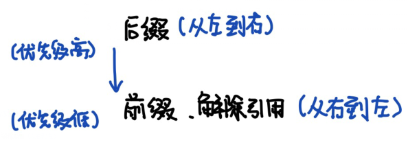 a++、后缀递减a--的优先级相同,但比前缀运算符的优先级高,这两个运算符以从左到右的方式结合。即: