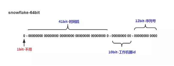 其核心思想是:使用41bit作为毫秒数,10bit作为机器的ID(5个bit是数据中心,5个bit的机器ID),12bit作为毫秒内的流水号,最后还有一个符号位,永远是0。
