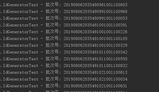 public class IdGeneratorTest { @Autowired private IdGenerator idGenerator; @Test public void testBatchId() { for (int i = 0; i < 100; i++) { String batchId = idGenerator.batchId(1001, 100); log.info("批次号: {}", batchId); } } @Test public void testSimpleUUID() { for (int i = 0; i < 100; i++) { String simpleUUID = idGenerator.simpleUUID(); log.info("simpleUUID: {}", simpleUUID); } } @Test public void testRandomUUID() { for (int i = 0; i < 100; i++) { String randomUUID = idGenerator.randomUUID(); log.info("randomUUID: {}", randomUUID); } } @Test public void testObjectID() { for (int i = 0; i < 100; i++) { String objectId = idGenerator.objectId(); log.info("objectId: {}", objectId); } } @Test public void testSnowflakeId() { ExecutorService executorService = Executors.newFixedThreadPool(20); for (int i = 0; i < 20; i++) { executorService.execute(() -> { log.info("分布式 ID: {}", idGenerator.snowflakeId()); }); } executorService.shutdown(); } }
