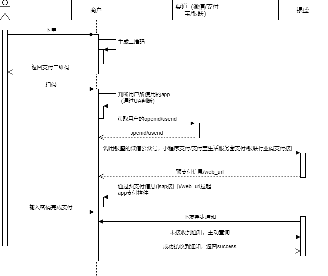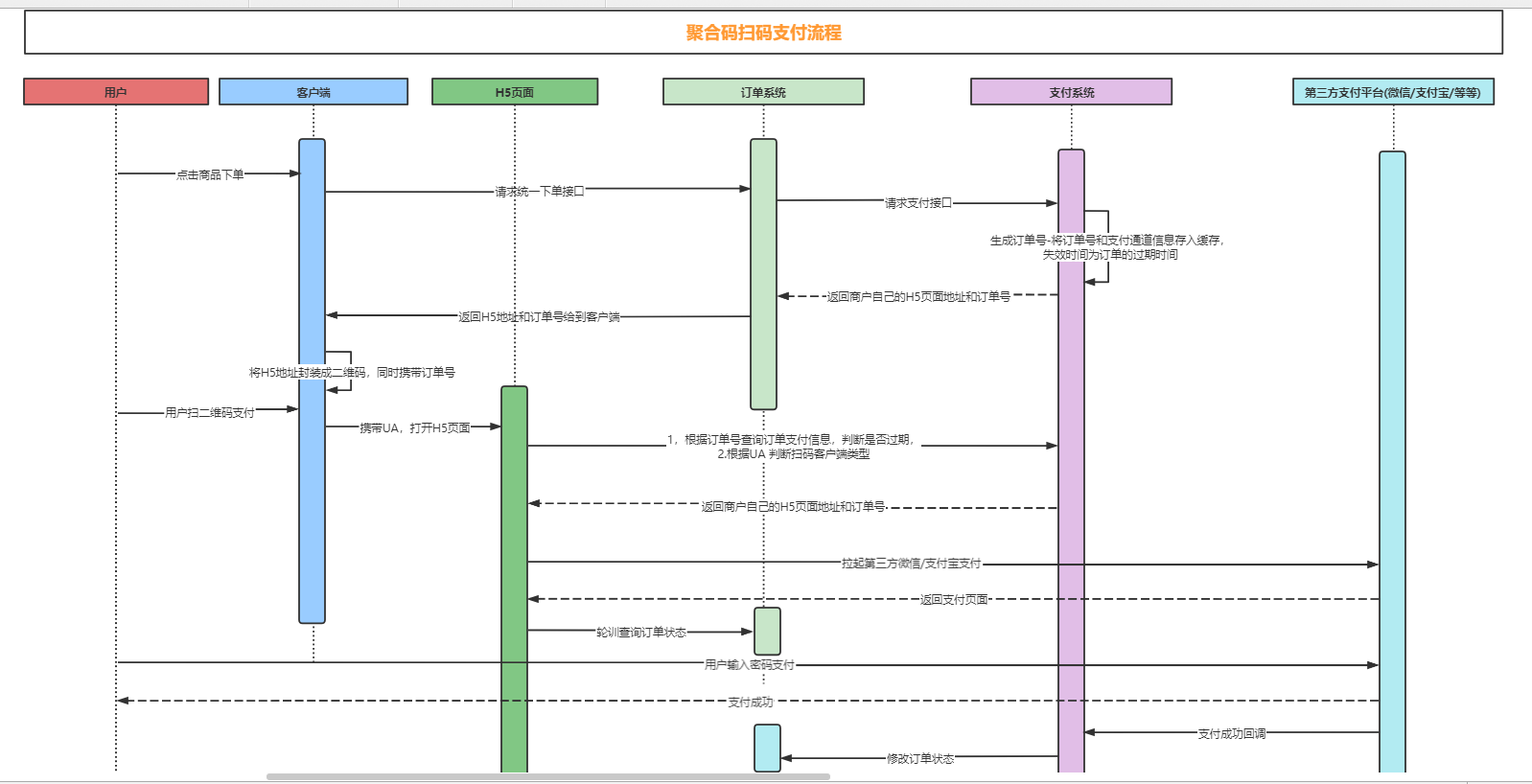 商户客户端生成二维码,二维码包含本次下单的订单号,用户扫码后,跳转到商户自己封装的H5页面,H5通过扫码客户端的User-Agent去判断是支付宝还是微信或其他APP进行扫码,然后在H5页面调商户系统的通过订单号进行预支付的接口返回给H5页面,然后H5调用微信/支付宝的SDK接口,拉起对应的支付页面引导用户支付,如下图: