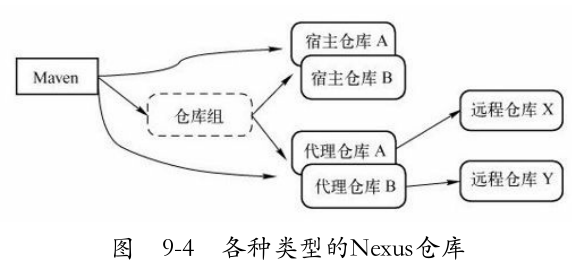 从图9-4中可以看到,Maven可以直接从宿主仓库下载构件;Maven也可以从代理仓库下载构件,而代理仓库会间接地从远程仓库下载并缓存构件;