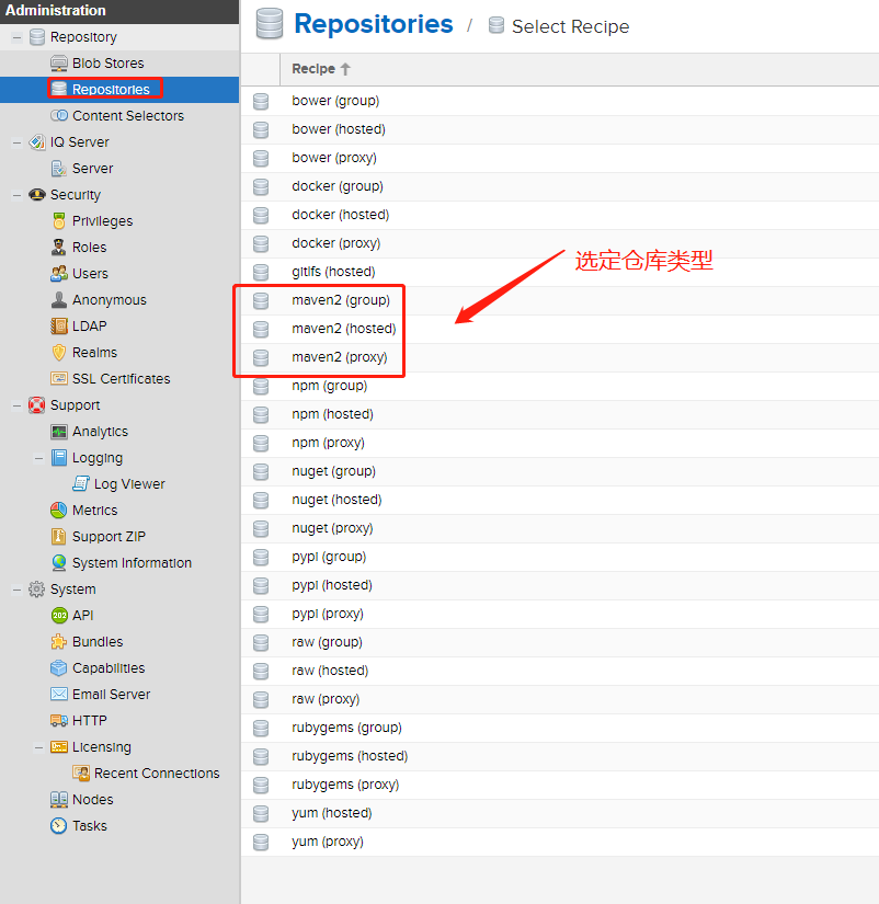 Nexus中有多种仓库的概念,对应的也内置有多种类型的仓库,这里主要有四种类型