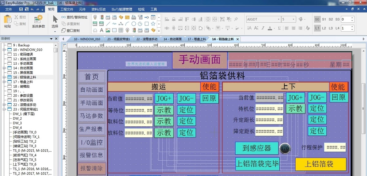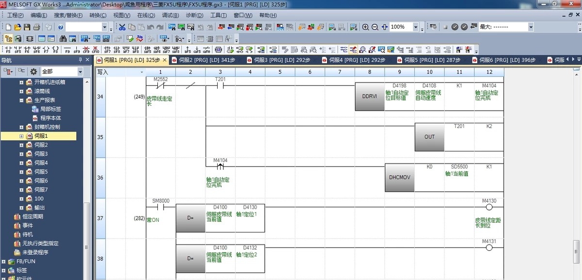 三菱FX5U七轴标准程序,程序通俗易懂,包含轴点动,回零,相对与绝对定位, 整个项目的模块都有:主控程序,复位程序,手动,生产计数,只要弄明白这个程序,就可以非常了解整个项目的程序如何去编写,从哪里开始下手,可提供程序问题解答,程序流程清晰明了;包含有触摸屏程序