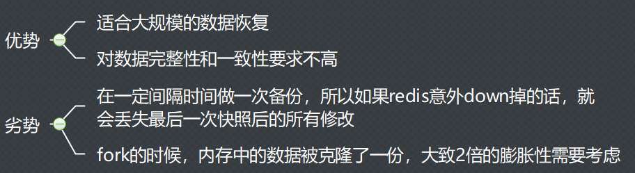 Redis会单独创建(fork)一个子进程来进行持久化,会先将数据写入到一个临时文件中,待持久化过程都结束了,再用这个临时文件替换上次持久化好的文件。整个过程中,主进程是不进行任何IO操作的,这就确保了极高的性能如果需要进行大规模数据的恢复,且对于数据恢复的完整性不是非常敏感,那RDB方式要比AOF方式更加的高效。RDB的缺点是最后一次持久化后的数据可能丢失。