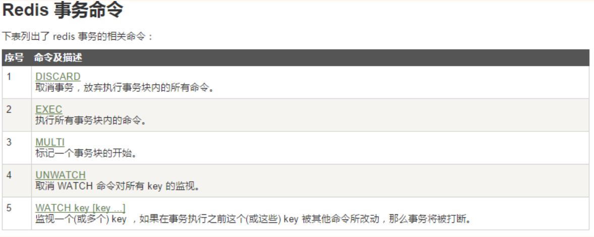 通过WATCH命令在事务执行之前监控了多个Keys,倘若在WATCH之后有任何Key的值发生了变化,EXEC命令执行的事务都将被放弃,同时返回Nullmulti-bulk应答以通知调用者事务执行失败