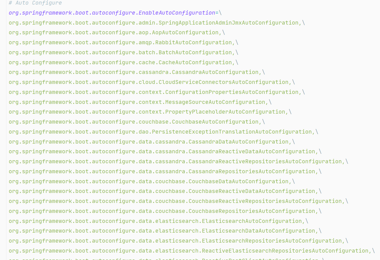 其中的关键功能由@Import提供,其导入的AutoConfigurationImportSelector的selectImports()方法通过SpringFactoriesLoader.loadFactoryNames()扫描所有具有META-INF/spring.factories的jar包。spring-boot-autoconfigure-x.x.x.x.jar里就有一个这样的spring.factories文件。