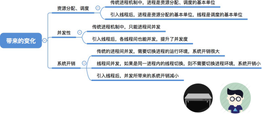 引入线程之后, 不仅是进程之间可以并发, 进程内的各线程之间也可以并发, 从而进一步提升了系统的并发度, 使得一个进程内也可以并发处理各种任务。