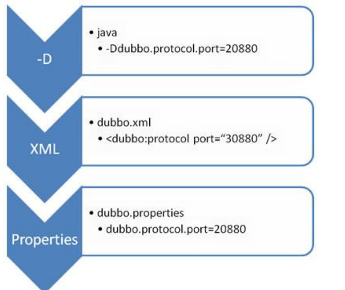 Properties 最后,相当于缺省值,只有 XML 没有配置时,dubbo.properties 的相应配置项才会生效,通常用于共享公共配置,比如应用名。