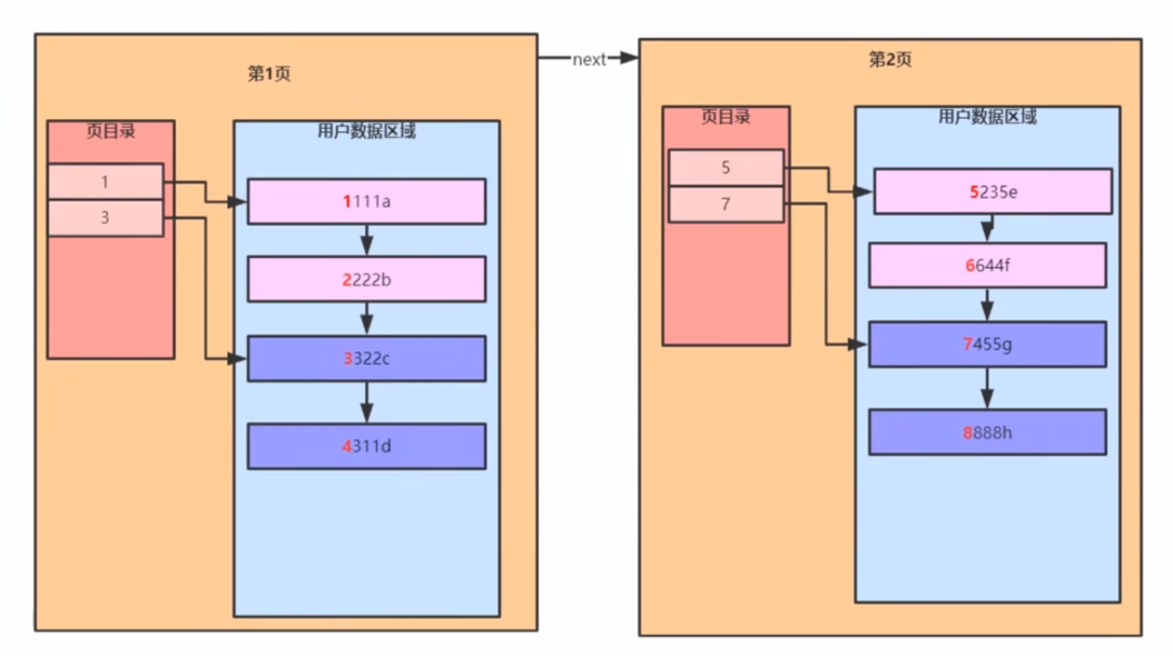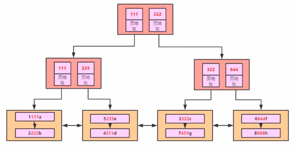 但是这样多个的结构本身就构成链表,在搜索不同的页时也会很慢,因此在此基础上形成b+树,如下图所示