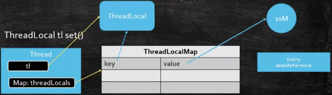 若是强引用,即使tl=null, 但key 的引用依然指向ThreadLocal对象,即:当ThreadLocal不再使用需要回收时,发现某个线程中ThreadLocalMap存在该ThreadLocal的强引用,无法回收,造成内存泄漏所以会有内存泄露,而使用弱引用则不会;