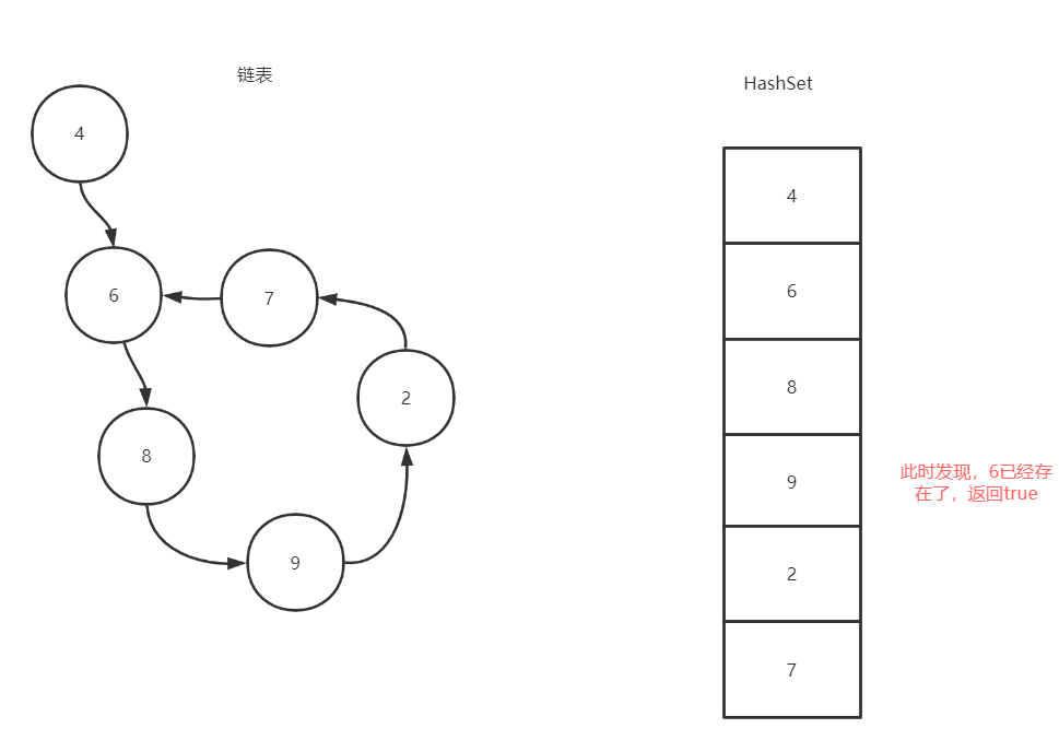 利用HashSet的唯一性,遍历链表,不存在则放入,存在则说明有环,没有环一定会返回null,图示如下: