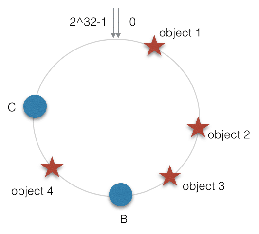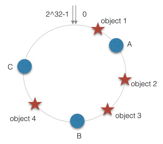 把各个cache服务器通过hash计算,根据hash值顺时针排列到圆环上,可以根据服务器的IP或者主机名进行计算