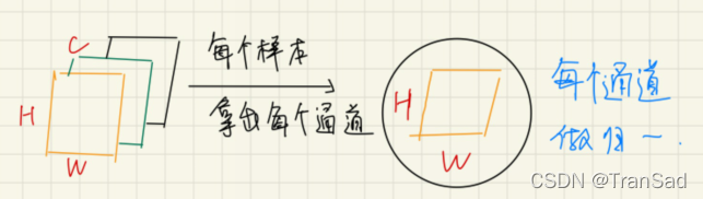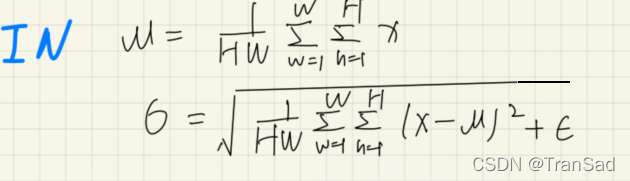 通过上篇我们已经知道IN是对于特征图的每一个通道的H、W求均值和标准差,IN的示意图和公式回顾如下: