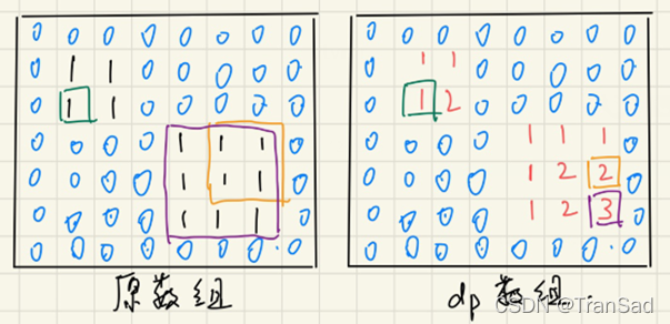 再具体解释一下,比如dp数组中黄色框起来的,对应的就是原数组中黄色框起来边长为2的正方形,因为值为2;绿色框起来的1,对应的就是原数组边长为1的正方形;紫色框起来的3,则对应最大的边长为3的正方形。