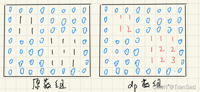 因此,只要我们得到了像右图这样的一个dp数组,我们就知道了最大正方形的边长,进而得到面积了。