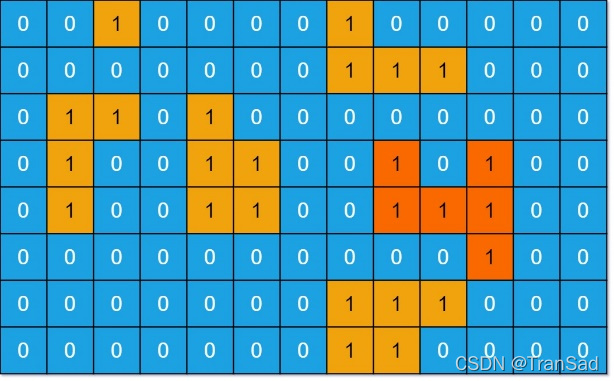 输入:grid = [[0,0,1,0,0,0,0,1,0,0,0,0,0],[0,0,0,0,0,0,0,1,1,1,0,0,0],[0,1,1,0,1,0,0,0,0,0,0,0,0],[0,1,0,0,1,1,0,0,1,0,1,0,0],[0,1,0,0,1,1,0,0,1,1,1,0,0],[0,0,0,0,0,0,0,0,0,0,1,0,0],[0,0,0,0,0,0,0,1,1,1,0,0,0],[0,0,0,0,0,0,0,1,1,0,0,0,0]]
