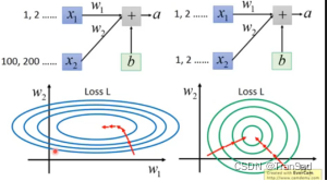 在这种情况下,我们知道w1*x1+x2*x2+b再送入激活函数可以得到这一层的输出,但是因为x1很小,x2很大,所以w2只需要稍微变化一点点就可以对结果产生影响,w2的梯度特别大(下降速度特别快);而w1可能得变化特别大才能对结果产生影响,w1的梯度特别小。在图中可以看到,在w2方向上,很容易就到达loss最低处;而在w1方向上,要走很远才能使loss值变化。