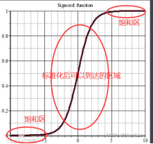 分布的变化容易导致数据进入激活函数的“梯度消失”区。以sigmoid函数为例,不管是上述哪种情况下的分布变化,一旦导致传入激活函数的数据分布在很大或者很小的地方——也就是图中的饱和区,那经过激活后数据就全部变成1或0了。我们希望能有一种方法将数据标准化到中间部分,从而利用好我们的激活函数。