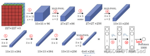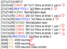 从图中可以看到AlexNet总共有有8层——包括5层的卷积(①③⑤⑥⑦)以及3层的全连接(⑨⑩和last)。