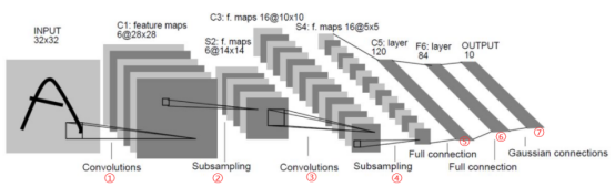 LeNet是最早发布的卷积神经网络之一了,LeNet是最早用来处理手写字体识别任务的网络,是非常简单而又经典。一般来说手写字体识别传入的图像是28*28的,但这里一开始先进行了padding=2的填充再卷积,所以下面图中input是32*32,这一点不同理解即可。对于每一步卷积以及池化(图中Subsampling降采样)我都做了标记,其具体操作解释对应着第二张图。
