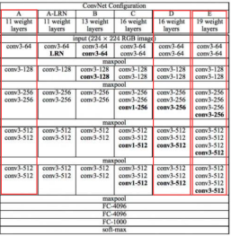 (这张表中每一列代表不同层数的VGG网络(框起来的三个分别就是VGG11,VGG16以及VGG19的卷积层部分,它们最后都带着三个同样的全连接层)。而其中的内容比如conv3-256表示此时使用256个3*3的卷积核进行卷积,下一步将得到256个特征图)