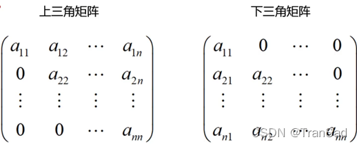 若主对角线下方全为0,上方不为0,则是上三角矩阵;若主对角线上方全是0,则是下三角矩阵。